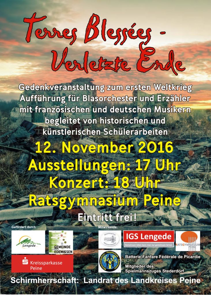 Am Freitag, 12. November findet ab 17.00 Uhr im Ratsgymnasium Peine eine Gedenkveranstaltung zum ersten Weltkrieg mit Ausstellung und Konzert statt. Die Vorbereitungen laufen seit über einem Jahr. Die IGS Lengede ist mit Schülern beteiligt.