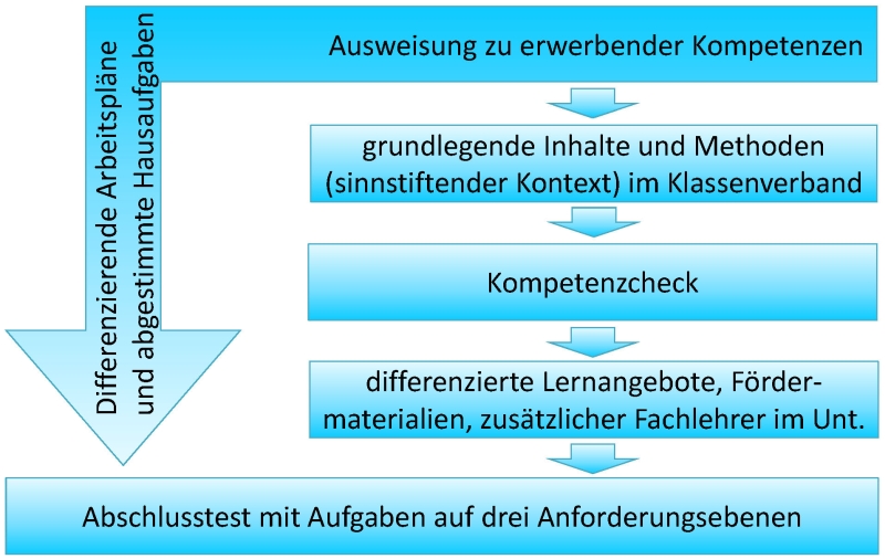 Eine Unterrichtseinheit beginnt i.d.R. mit dem gemeinsamen Unterricht an einem für alle Schüler relevanten Thema. Diesem Einstieg folgt ein Kompetenzcheck. Dort werden die für die Unterrichtseinheit relevanten Fähigkeiten, Fertigkeiten und Kenntnisse überprüft. In Abhängigkeit vom Vorwissen gestaltet sich die individuelle Weiterarbeit an Arbeitsmaterialien auf unterschiedlichen Anspruchsebenen. Lehrkräfte – ab Jahrgang 7 sind teilweise zwei Lehrkräfte gemeinsam im Unterricht – unterstützen die leistungsstarken Schüler genauso wie die Schüler mit Lernschwierigkeiten. Die Unterrichtseinheit schließt mit einem Kompetenztest ab. Zumeist handelt es sich dabei um eine Klassenarbeit.