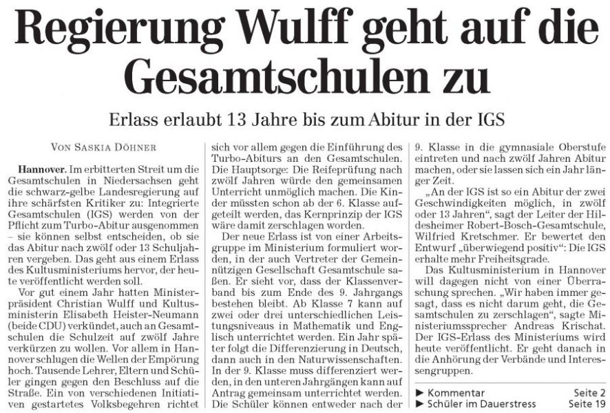 PAZ: "Regierung Wulff geht auf die Gesamtschulen zu"