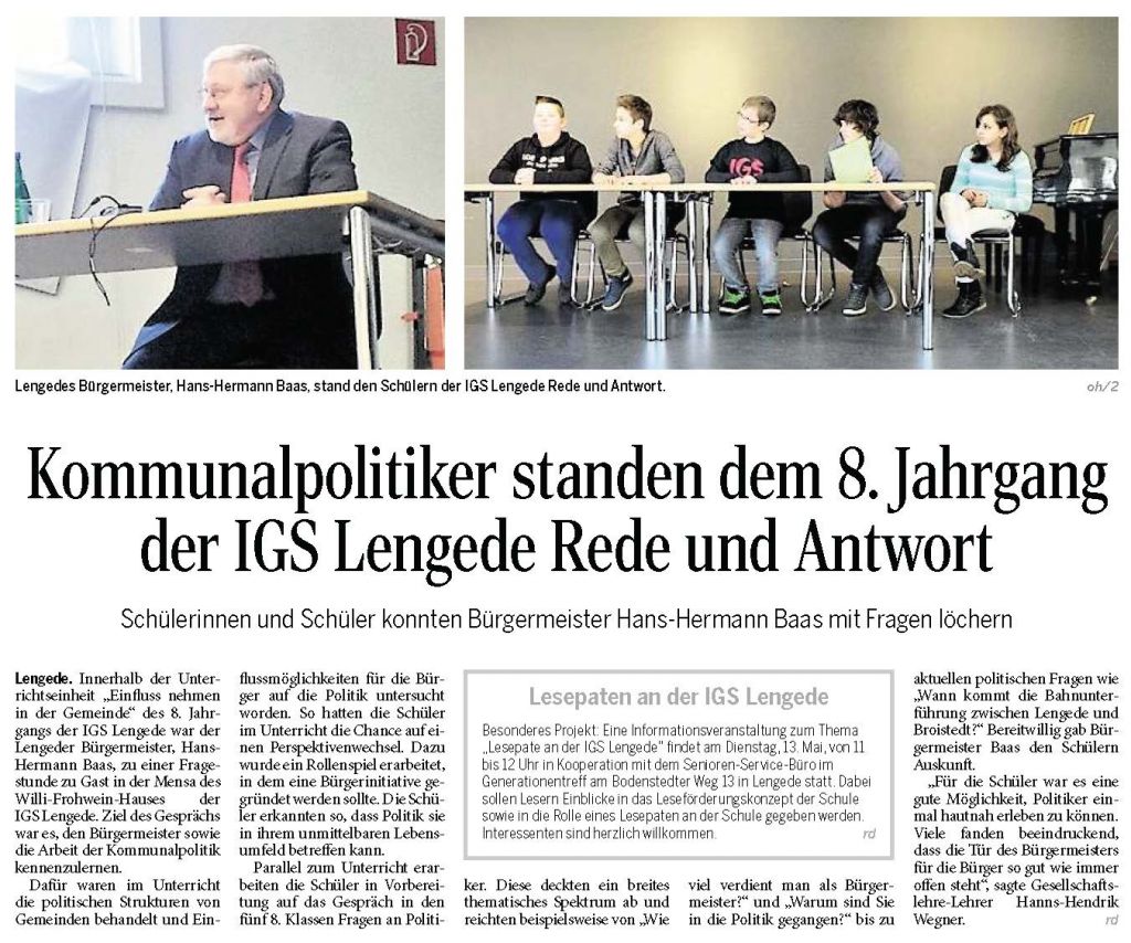 PAZ: "Kommunalpolitiker standen dem 8. Jahrgang der IGS Lengede Rede und Antwort"