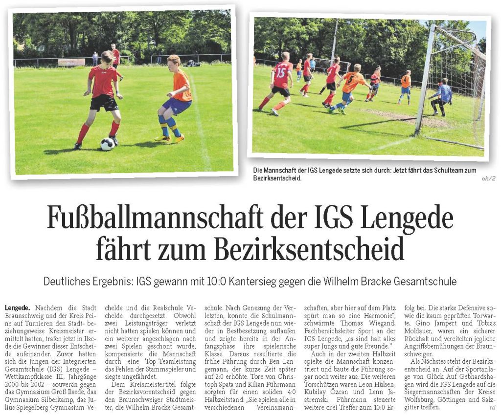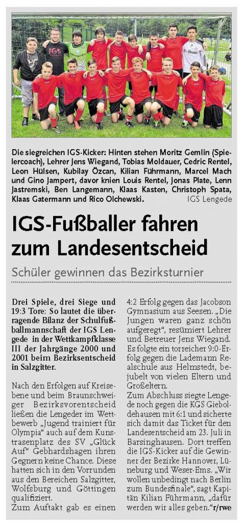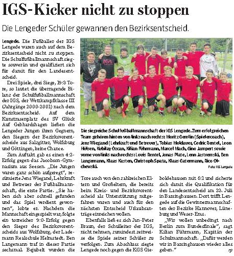 PAZ: "Fußballmannschaft der IGS Lengede fährt zum Bezirksentscheid"