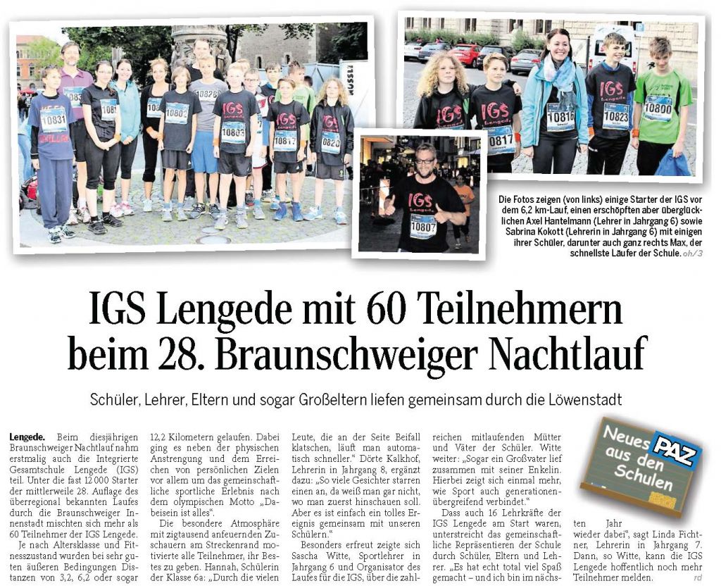 PAZ: "IGS Lengede mit 60 Teilnehmern beim 28. Braunschweiger Nachtlauf"
