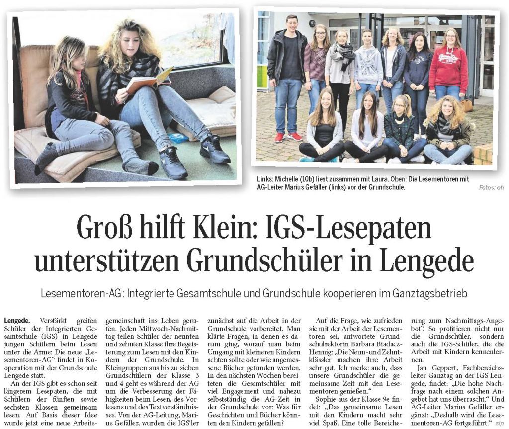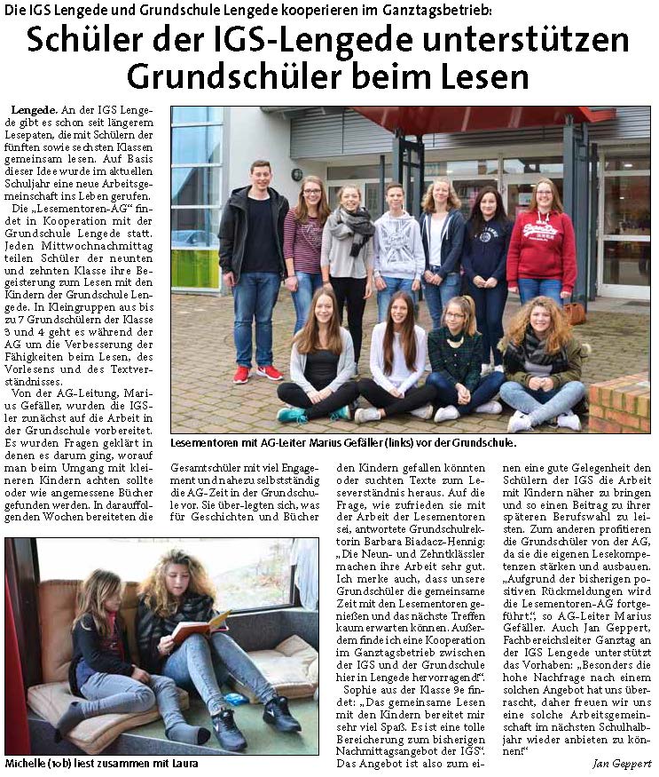 PAZ: "Groß hilft Klein: IGS-Lesepaten unterstützen Grundschüler in Lengede"