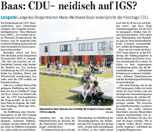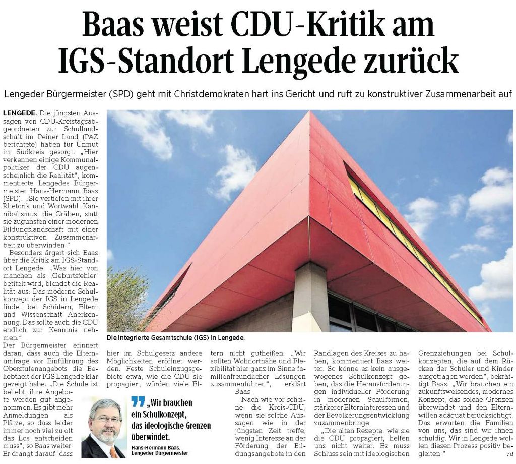 PAZ: "Baas weist CDU-Kritik am IGS-Standort Lengede zurück"