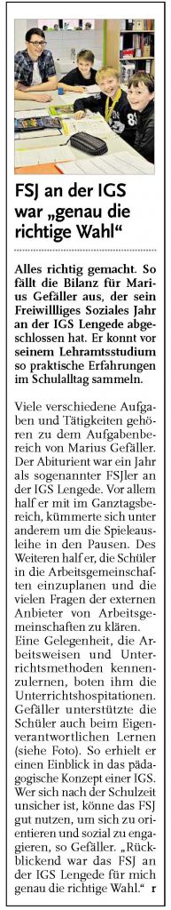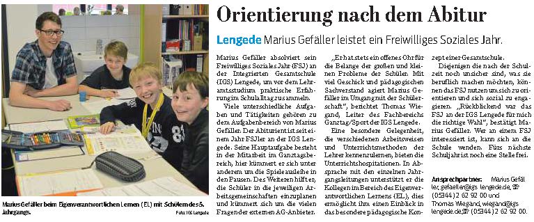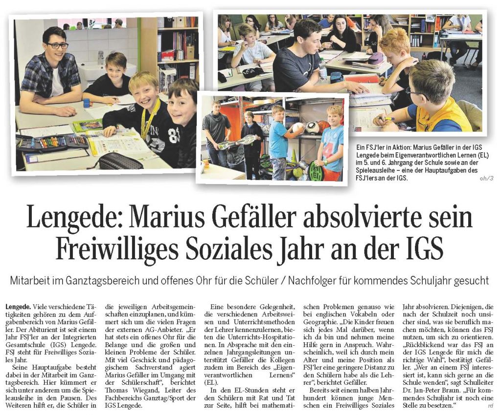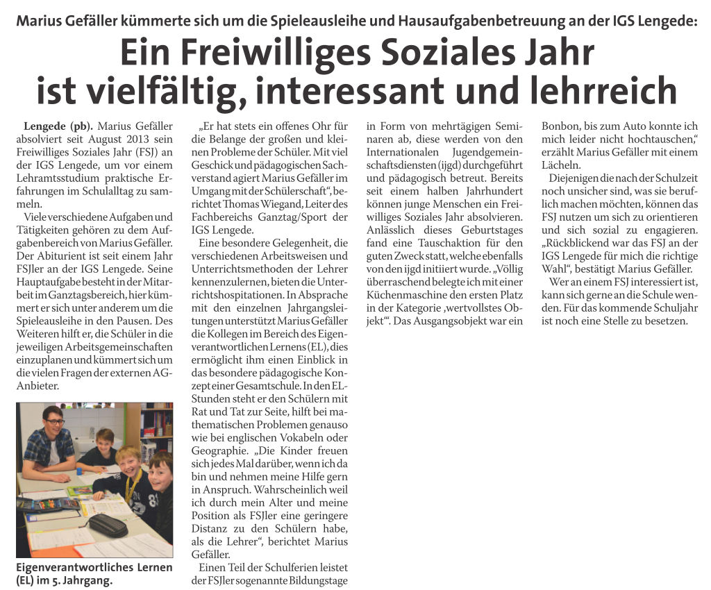 PAZ: "Lengede: Marius Gefäller absolvierte sein Freiwilliges Soziales Jahr an der IGS"