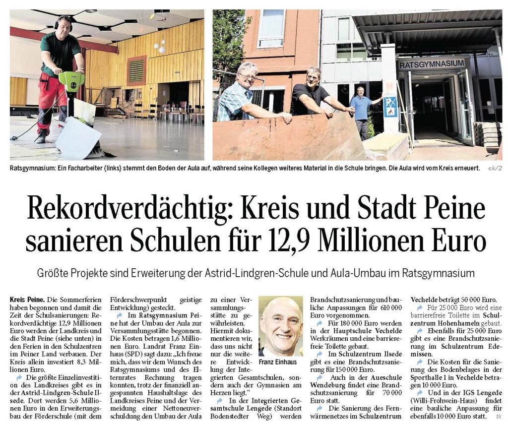 PAZ: "Rekordverdächtig: Kreis und Stadt Peine sanieren Schulen für 12,9 Millionen Euro"