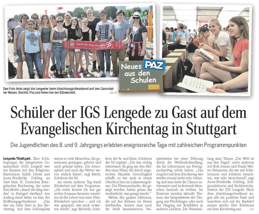 PAZ: "Schüler der IGS Lengede zu Gast auf dem Evangelischen Kirchentag in Stuttgart"
