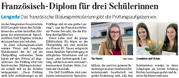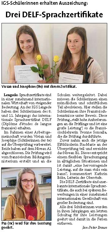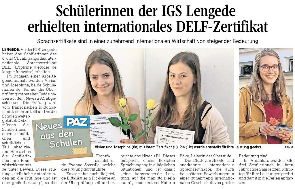 PAZ: "Schülerinnen der IGS Lengede erhielten internationales DELF-Zertifikat"