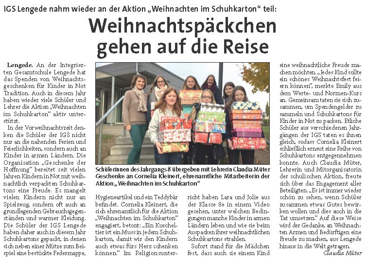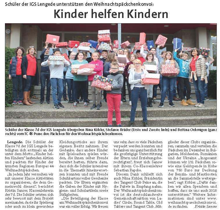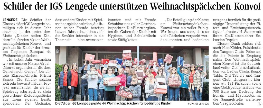 PAZ: "Schüler der IGS Lengede unterstützen Weihnachtspäckchen-Konvoi"