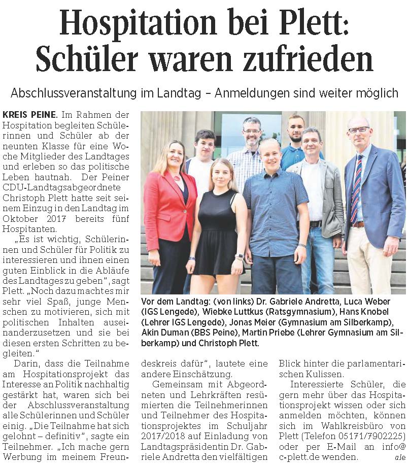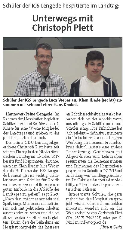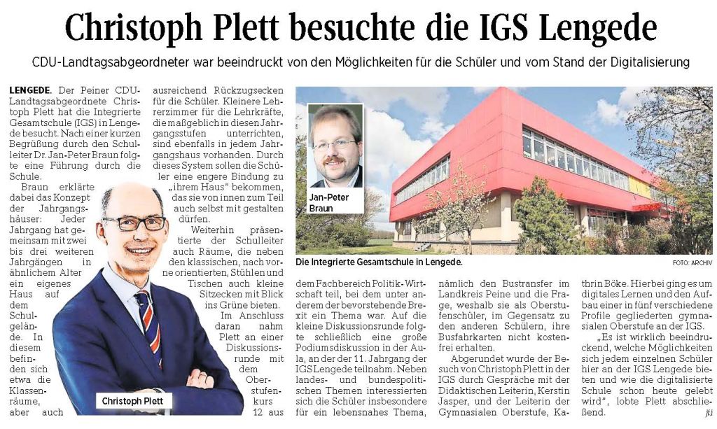PAZ: "Christoph Plett besuchte die IGS Lengede"