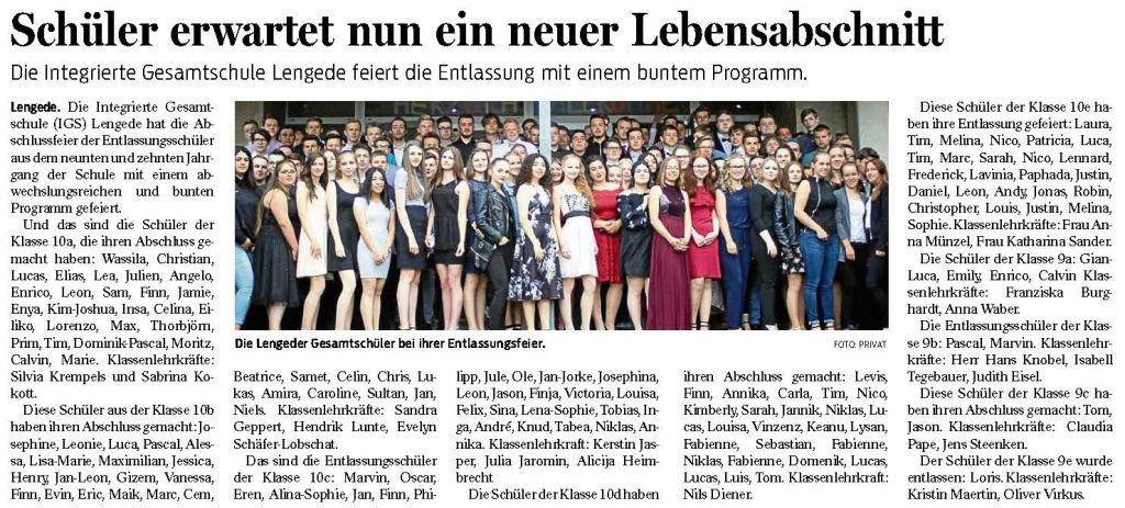 PAZ: "Integrierte Gesamtschule (IGS) in Lengede feierte ihre Schulabgänger"