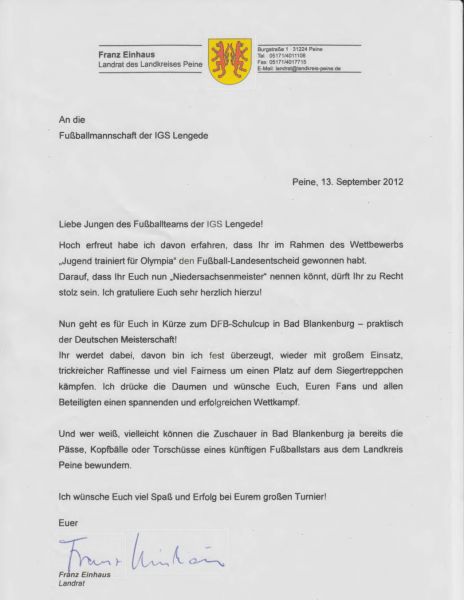 "Glückwunsch von H. Alpers zum Schulfußball"