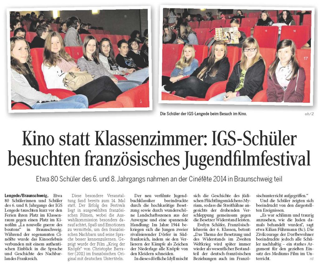 PAZ: "Kino statt Klassenzimmer: IGS-Schüler besuchten französisches Jugendfilmfestival"