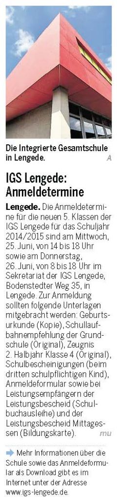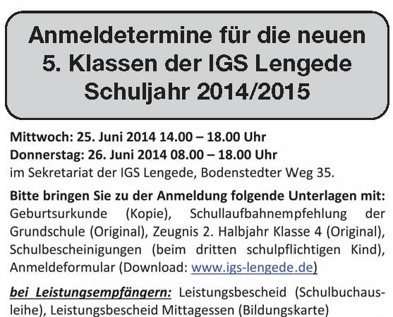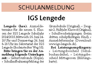 RSB: "Anmeldetermine für die neuen 5. Klassen der IGS Lengede Schuljahr 2014/2015"