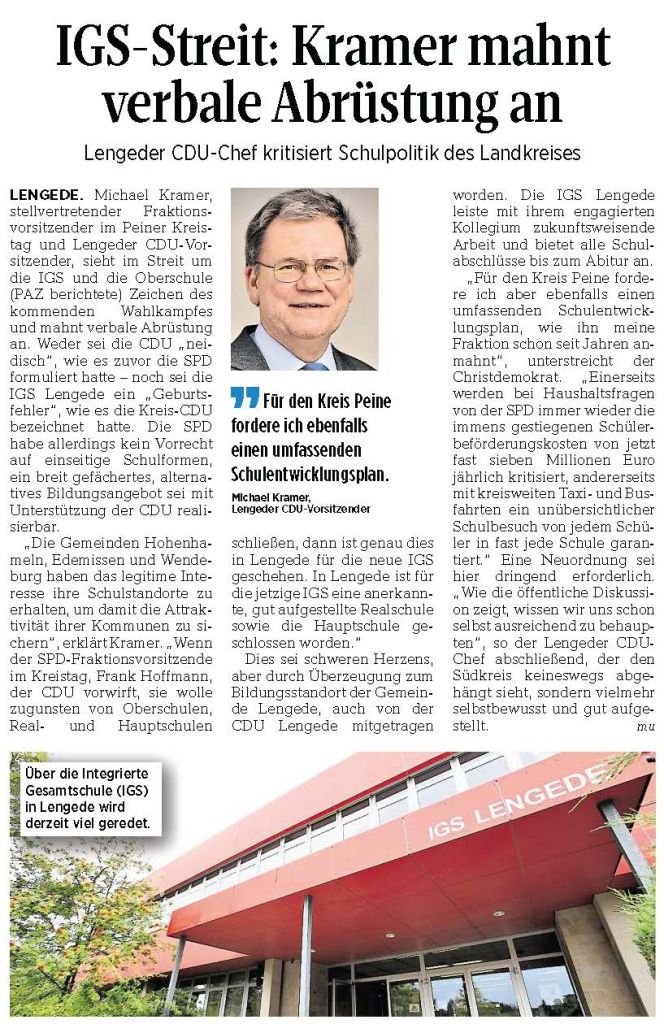 PAZ: "IGS-Streit: Kramer mahnt verbale Abrüstung an"