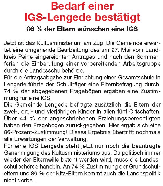 PN: "Bei Lengeder-Kindergarten-Eltern ist Zustimmung zur IGS sehr groß"