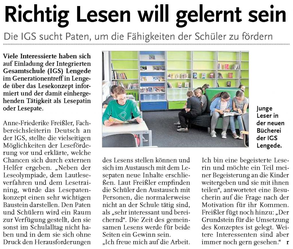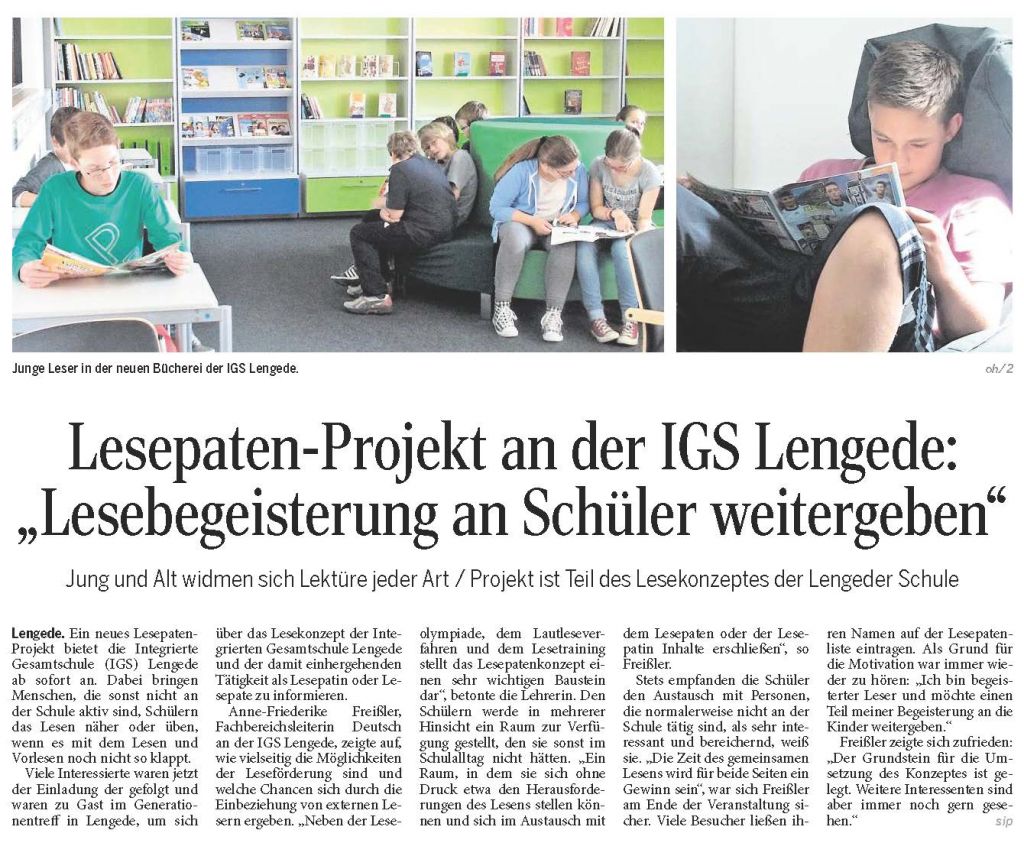 PAZ: "Lesepaten-Projekt an der IGS Lengede: „Lesebegeisterung an Schüler weitergeben“"