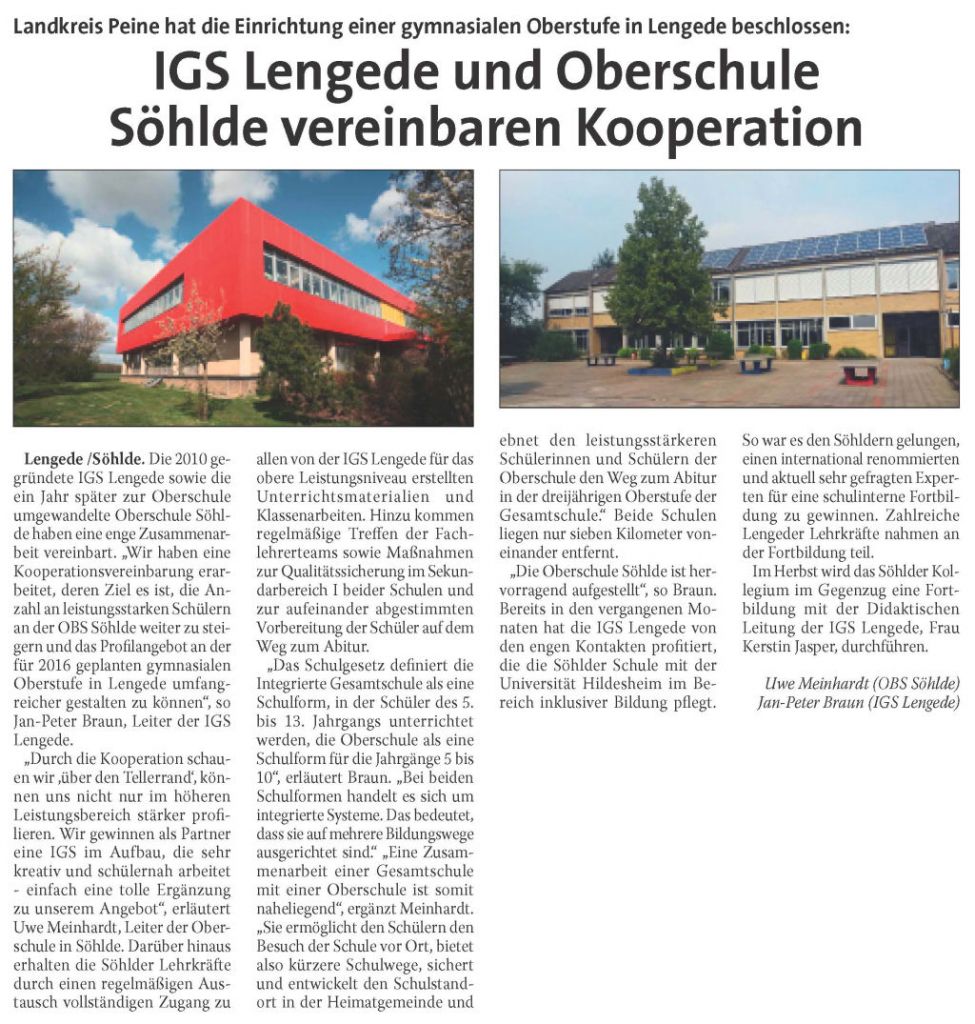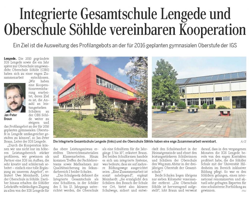 PAZ: "Integrierte Gesamtschule Lengede und Oberschule Söhlde vereinbaren Kooperation"