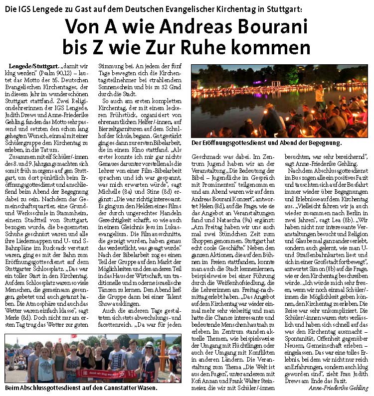 PAZ: "Schüler der IGS Lengede zu Gast auf dem Evangelischen Kirchentag in Stuttgart"