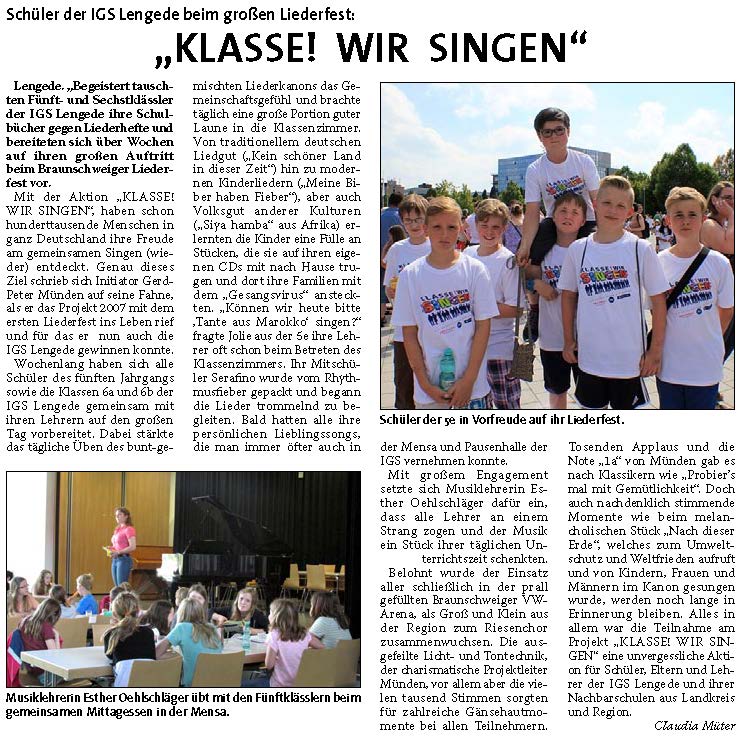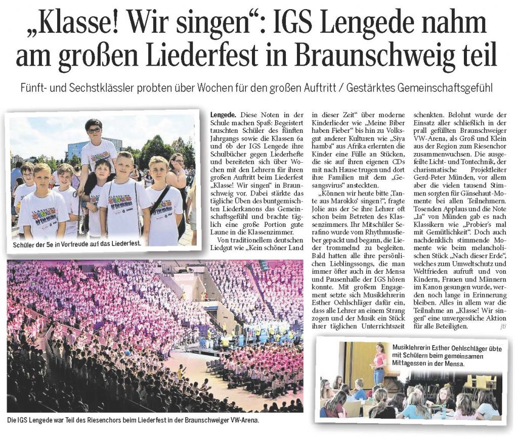 PAZ: "„Klasse! Wir singen“: IGS Lengede nahm am großen Liederfest in Braunschweig teil"