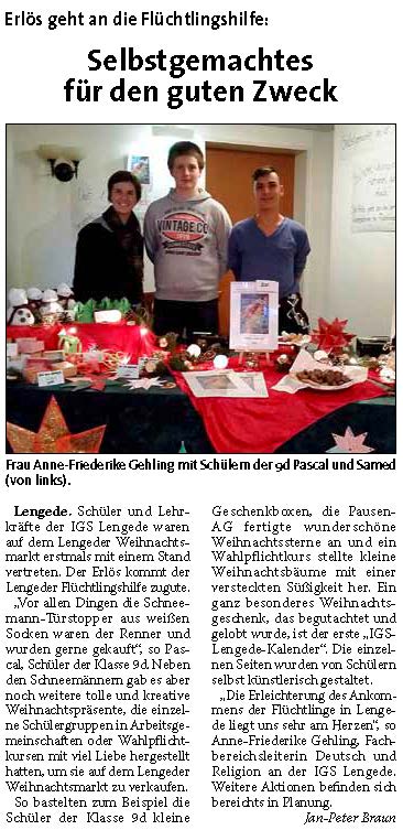 PAZ: "IGS-Schüler verkauften Präsente auf dem Lengeder Weihnachtsmarkt"