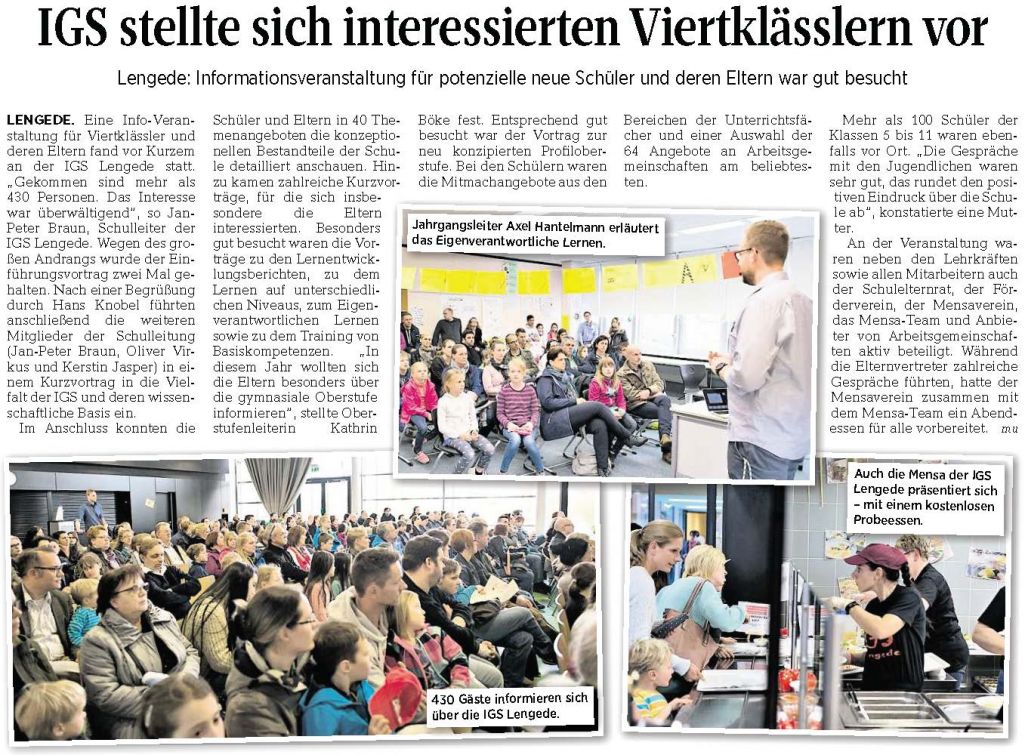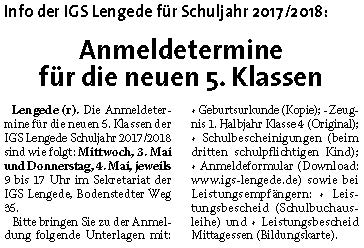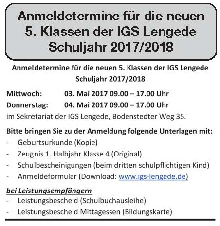 RSB: "Anmeldetermine für die neuen 5. Klassen der IGS Lengede Schuljahr 2017/2018"