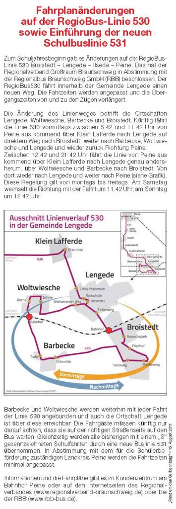 RSB: "Fahrplanänderungen auf der RegioBus-Linie 530 sowie Einführung der neuen Schulbuslinie 531"
