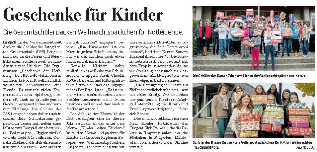 PAZ: "Schüler der IGS Lengede unterstützen Weihnachtspäckchen-Konvoi"