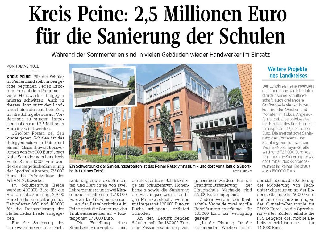 PAZ: "Kreis Peine: 2,5 Millionen Euro für die Sanierung der Schulen"