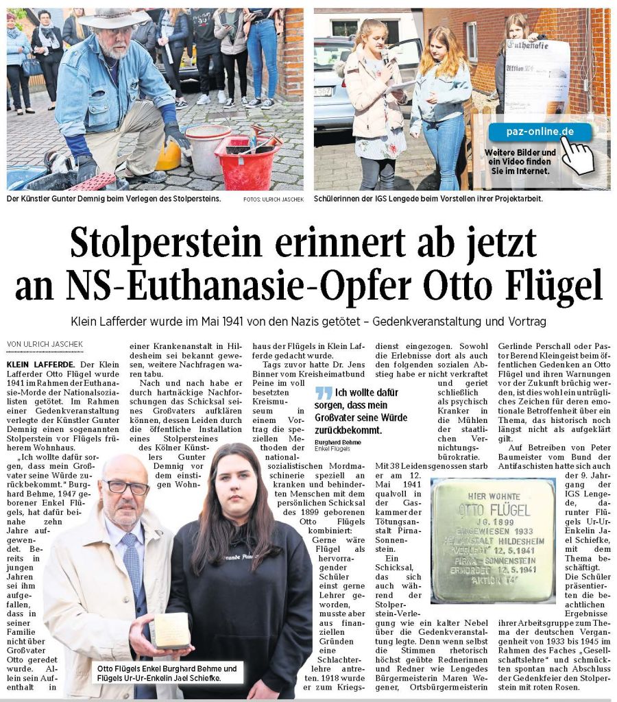 PAZ: "Stolperstein erinnert ab jetzt an NS-Euthanasie-Opfer Otto Flügel"